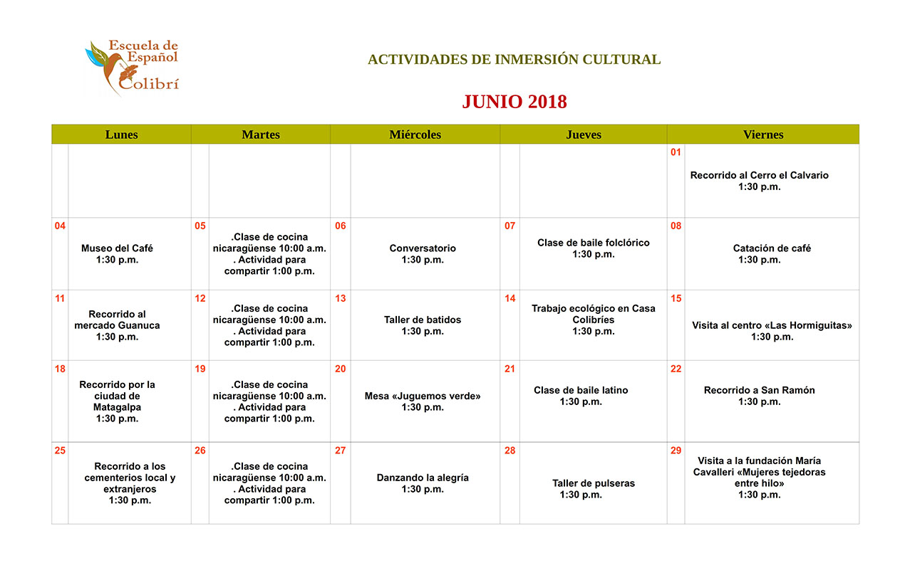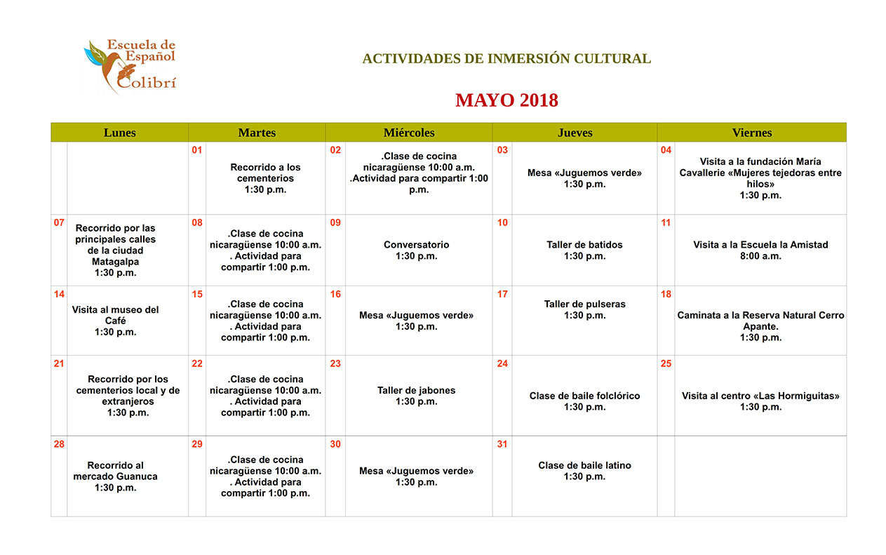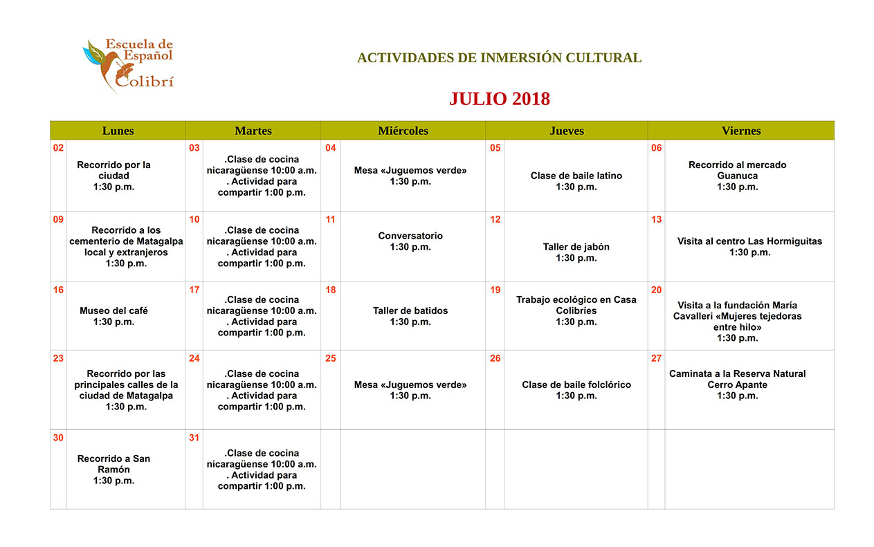 • The Colibrí Spanish School has a monthly program for the socio-cultural activities.